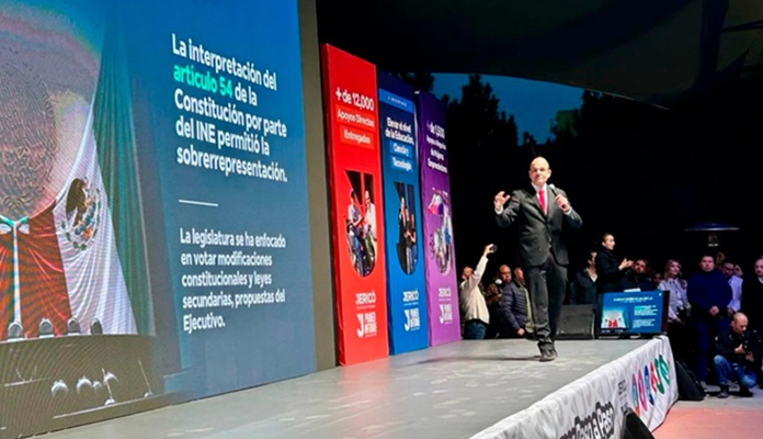 Durante su intervención, Abramo Masso destacó que la Cámara de Diputados se encuentra actualmente con una sobrerrepresentación del partido gobernante, con Morena en el 50% de las curules, Acción Nacional 14%, Partido Verde 12%, PT 9%, PRI 7.46%, MC 5.6% y partidos independientes 0.2%, lo que según él ha complicado la toma de decisiones y la negociación de reformas.