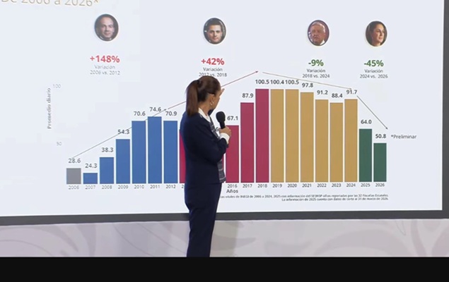 Durante la conferencia matutina de Claudia Sheinbaum, Marcela Figueroa, titular del Secretariado Ejecutivo del Sistema Nacional de Seguridad Pública, detalló que el promedio diario de homicidios pasó de 86.9 a 51.4 casos, lo que equivale a 35 víctimas menos por día en ese periodo.