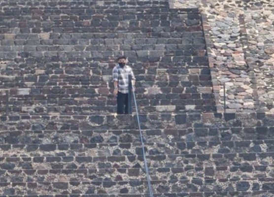 En un video que circula en redes, se observa a un hombre que disparó desde la parte alta de la Pirámide de la Luna; los turistas desconcertados pidieron auxilio a la Policía.
